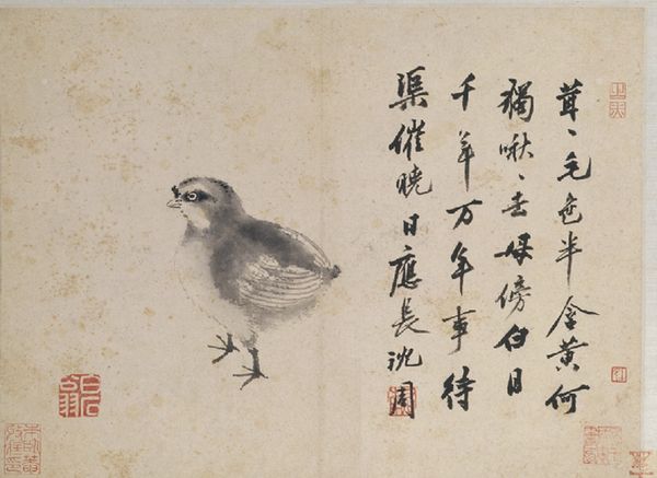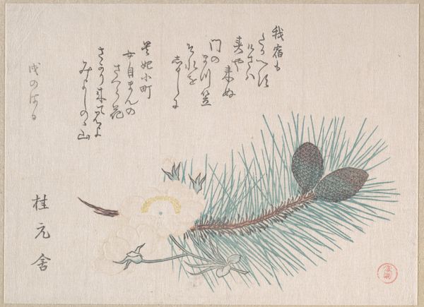 Chokko Roshû created this print called ‘Kwartel’ using woodblock printing techniques. The composition balances text and image, yet it is the unassuming bird on the right that first captures our attention. Note the delicate strokes that define its feathers, each line contributing to the texture that invites a sense of tactile familiarity. The bird is framed by a climbing vine with simple, rounded leaves. These shapes create a visual rhythm, leading our eye upwards, and the small red blossoms add a playful contrast to the muted tones of the bird. On the left, columns of text mirror the verticality of the vine. The characters, like the natural elements, possess a certain visual weight, contributing to the overall balance of the piece. This synthesis of word and image reflects a deep integration of artistic and intellectual pursuits. Through form and structure, Roshû invites us to consider the interplay between observation, representation, and cultural expression.