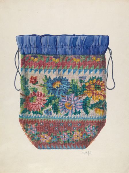 Editor: Here we have Frank C. Barks' "Bag" from around 1938, rendered in mixed media and textile. It’s quite charming! The blue and grey floral pattern has an almost digital quality, despite the likely hand-crafted nature. What strikes you about it? Curator: The emphasis on material and process is central here. It isn’t just a bag; it’s a demonstration of textile techniques and design applied to everyday life. Consider the labour involved, each bead carefully placed, revealing a pattern and hinting at a possible democratization of fashion via accessible patterns. Editor: That's interesting! It’s easy to overlook the process when considering an object like this, especially when mass production is so normalized now. Do you think it challenges our traditional notions of art versus craft? Curator: Absolutely. It pushes against those hierarchies. This bag sits at an interesting intersection, likely mass-produced in the image, yet relying on techniques historically relegated to 'craft.' Where does it fit within 1930’s consumer culture? Editor: It makes me wonder about the intended consumer too – who would have carried this, and what would it have signified to them? A sense of personal style? Affordability? Curator: Exactly! By analyzing the materials—the beads, the lining—we start to understand the bag's context and the socioeconomic factors at play. It opens a window into the consumer habits and material conditions of the era. Editor: I never thought of looking at a bag this way. Thinking about the labour and materials adds so much more depth! Curator: Precisely. By focusing on materiality, we unpack layers of meaning far beyond its superficial purpose.