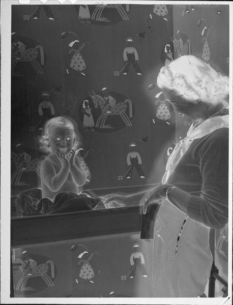 Curator: Lucian and Mary Brown's "Untitled (girl playing with doll)," currently held at the Harvard Art Museums, presents a seemingly simple domestic scene. Editor: There’s a haunting quality to this, even in its reversed tones. The stark contrast amplifies the girl's isolation, highlighting the performative aspect of childhood. Curator: Exactly. Dolls, traditionally symbols of innocence, here become tools for the construction of gender and societal expectations. The surrounding environment, especially the window, feels less like a source of light and more like another layer of confinement. Editor: The doll itself is an icon, a vessel for projected hopes and anxieties. Notice how its features, though obscured, seem almost knowing, echoing the girl’s own journey into self-awareness. Curator: And looking through a contemporary lens, one can’t ignore the socio-political implications of representation—who gets to play, and what roles are they assigned? Editor: This piece makes you consider how deeply ingrained these archetypes are in our cultural narratives, and how they continue to shape our understanding of identity and belonging. Curator: Yes, it's a reminder of the complex layers embedded in seemingly simple images. Editor: It's remarkable how a small photograph can evoke such profound questions.