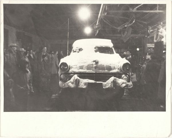 Curator: Robert Frank's gelatin silver print, "Automobiles--Long Beach, California," made in 1956, offers a compelling glimpse into postwar American life. My first thought? Overwhelming! A mass of metal and implied motion all struggling for space in the frame. Editor: I agree, the visual density here is quite striking, almost claustrophobic. Note how Frank utilizes high contrast and seemingly off-kilter composition. The vehicles almost blur into each other, conveying a sense of uniformity despite the clear differences in make and model. Curator: Exactly. Semiotically, each car becomes more than just a vehicle, a marker of status and societal aspirations. They’re these hulking, gleaming emblems of upward mobility but their massing suggests a kind of conformity, a reduction of individuality. Editor: And yet, look closer at the people framed by and perched atop these automobiles. The photograph hints at the social structures in postwar America—racial segregation and a booming consumerist culture which, nevertheless, perpetuated anxieties about social status and access. Those gazing out to the horizon possibly evoke alienation. Curator: Perhaps. But formally, I read it more as Frank disrupting established photographic conventions. The composition challenges the viewer. It isn't about perfectly framed chrome; instead, it feels raw and immediate. It reminds me, aesthetically, of Walker Evans and the Photo-Secession, yet more spontaneous. Editor: Well, I also think it echoes Weegee’s unflinching social commentary in some ways. Look at Frank's famous book, *The Americans*, it certainly contains unflinching, though more intimate, perspectives on class and race during this era. Here we find themes like wealth distribution, anxieties of postwar American society, themes not overtly present, but worth digging for within the photograph. Curator: True, context does matter, and your interpretation definitely adds layers. However, what persists for me is Frank's deconstruction of photographic norms—his manipulation of light, his rejection of a clean, picturesque aesthetic—creates something far more conceptually engaging. It’s almost brutally elegant. Editor: I see the merit in both. Its power lies in its formal tension but also the societal critiques quietly at play within these complex aesthetic choices, wouldn’t you say? Curator: Absolutely. It’s the dynamic interaction of those things, I concede. Editor: It leaves a long echo, doesn't it?