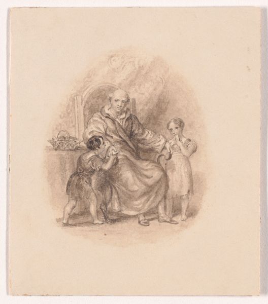 Lorenz Frølich created this delicate drawing, "Godter i lommen," using graphite on paper, a common yet versatile choice reflecting mid-19th-century artistic practices. The material itself, humble as it is, allows for incredible detail. Look at the soft gradations of tone creating the folds in the man’s jacket, and the gentle curves defining the child's form. The graphite, applied with varying pressure, builds a scene of intimacy; the father figure offering a treat from his pocket. Frølich’s skill lies in how he coaxes depth and texture from such a simple medium. The paper’s surface is integral here, its slight toothiness catching the graphite to create subtle shadows and highlights. This drawing is not merely a representation, but an intimate record of a tender moment, achieved through the directness and simplicity of graphite on paper. It reminds us that artistry isn't always about complex techniques, but sensitive execution.