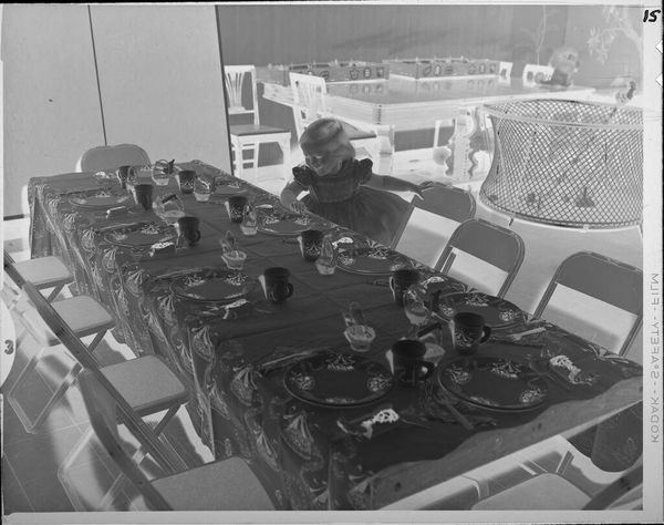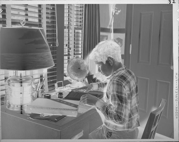 Editor: This photograph, simply titled "Untitled (man in wheelchair)" by Ken Whitmire Associates, shows a man in a domestic setting. It's quite striking because it's a photographic negative, which gives it an eerie feel. How do you interpret this work through a materialist lens? Curator: Considering the photographic process, the negative itself becomes a crucial artifact. What were the economic conditions of photography at the time? Was this image intended for mass reproduction, or was it a personal document? Editor: That's interesting. I hadn't considered the role of the negative itself as a material object with its own history. Curator: Also, the wheelchair. How does its presence alter the labor normally associated with movement and access? Does it highlight social inequalities related to disability? Editor: I see what you mean. The image isn't just about the person, but the social and material systems that shape his experience. Thanks for pointing that out! Curator: Exactly. Analyzing the materials and their production opens up new avenues for understanding the artwork's meaning.
