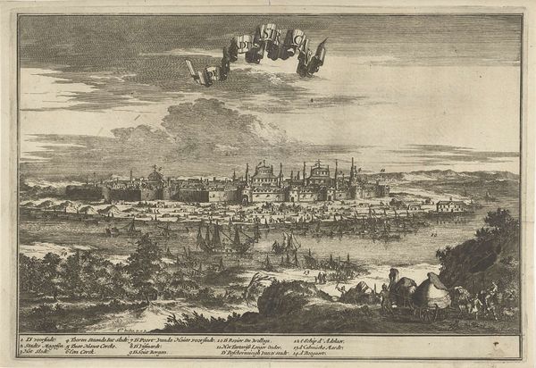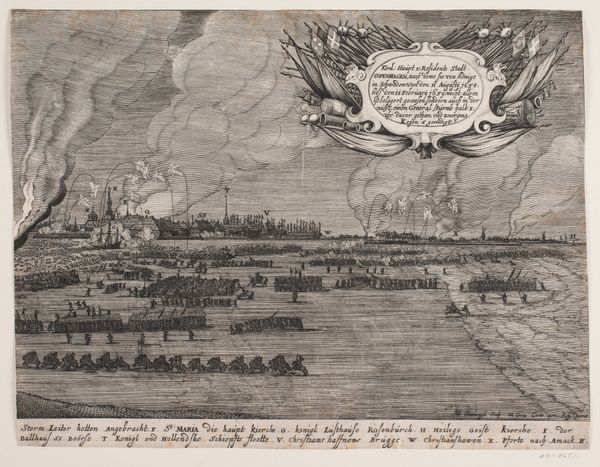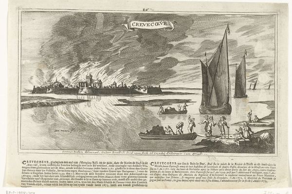 Curator: This intricate print, residing here at the Statens Museum for Kunst, depicts the "Voyage of Willem Isbrandtse Bontekoe to the East Indies," dated sometime between 1594 and 1678, crafted by Salomon Savery. What impressions strike you immediately? Editor: A feeling of constrained chaos! The composition, a series of framed vignettes surrounding a central scene, seems almost like a graphic novel spread. But the sheer density of detail—the turbulent waves, the dense smoke—creates a very unsettling visual experience. Curator: Precisely. The central image, of course, captures the explosive destruction of Bontekoe’s ship. Its wreckage is engulfed in flames, mirroring a larger, existential turmoil. Surrounding it are smaller scenes of both triumph and tragedy, hinting at the broader narrative. Look at the portrait. Editor: That commanding central portrait, with the ruff and stern expression, anchors the composition and lends a gravitas amidst the chaos. It acts as the still, watchful eye amidst the depicted maritime turmoil. It also, in a semiotic sense, provides a point of access to decode the artwork. Curator: A crucial anchor, connecting us to the historical figure and inviting us to decode his story. Beyond the drama, it’s also a fascinating document of Dutch Golden Age artistry, meticulously detailed. Consider the symbolic import of shipwrecks throughout history and the idea of confronting fate on an uncharted path. Editor: I can see those symbolic connections clearly. Considering how each panel is compartmentalized, it's a world encapsulated by narrative boxes; each frame contributes an episode to the overall theme of perilous exploration, resilience, and the unpredictable power of nature. The overall effect, pictorially, creates a mood that can feel, as a viewer, quite disturbing and cautionary. Curator: Disturbing indeed! But there is some triumph contained as well; survival amidst the shipwreck. The imagery would clearly resound with the contemporary viewers' sensibilities. But regardless of era, the raw humanity persists. Editor: So we move from observation of structured, representational elements to that emotional and social connection with humanity – to empathize. An image from the Dutch Golden Age still carries that vital charge, even today.