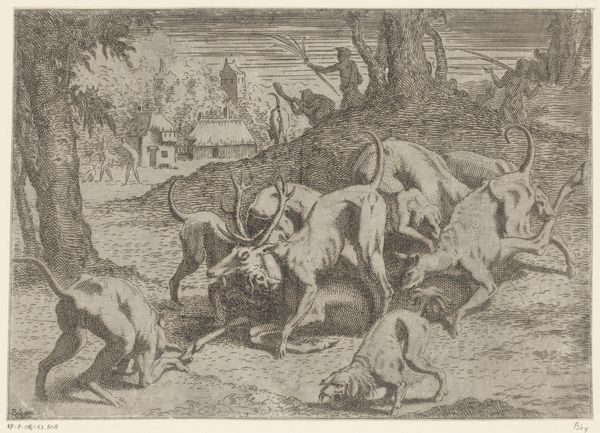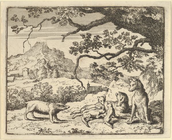 Allart van Everdingen created this engraving, "The Dread of Renard's Enemies," as an illustration for Hendrick van Alcmar's Renard The Fox. Look at the composition of tight lines that create a sense of depth and tension in this small format. The animals, rendered with sharp contrasts, are clustered in a seemingly natural yet carefully arranged space. Everdingen uses the allegorical nature of animals to tap into human social commentary. The detailed cross-hatching and varied line weights construct a narrative tableau, dense with symbolic weight. There is the fox, Renard, its enemies arranged in the composition to express a hierarchy of power and fear. The technical precision of the engraving allows for a textured surface that brings each animal to life, enhancing the dramatic tension of the scene. Notice how the formal choices reflect the complex social dynamics of the fable. The close attention to detail elevates the visual and intellectual impact of the work, and leaves us to contemplate the enduring nature of these power structures and the artist’s critical commentary.