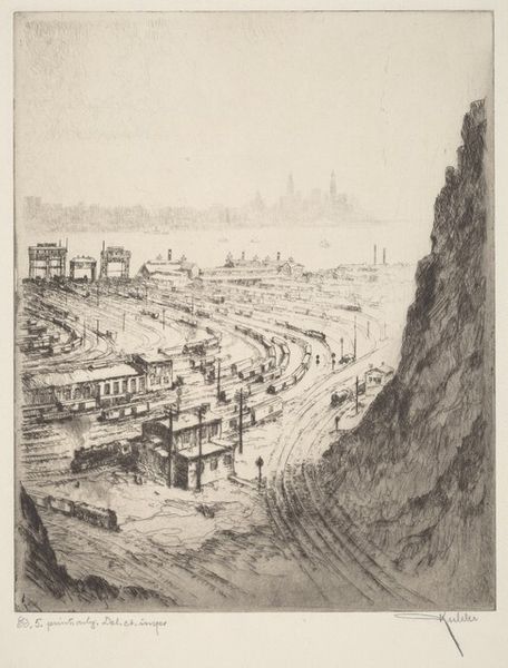 Curator: Looking at this piece, I'm immediately drawn to the sheer intricacy achieved through such delicate lines. Editor: I'm interested to learn that this is "Benares, No. 1" an etching crafted by Ernest Stephen Lumsden around 1912. It presents a fascinating interplay between architecture and the landscape. The texture of the paper itself seems integral to the work. Curator: Precisely. Note how the composition guides the eye—starting with the detailed structures atop the rising bank, moving downward towards the water where we see people arriving by boat. The perspective is very well controlled. There's an undeniably timeless quality to it. Editor: What stands out to me is the clear depiction of labor implied along the ghats, from construction materials piled along the shoreline to those manning boats on the water. It prompts questions about Lumsden's encounter with this city and what type of economy he's emphasizing through his materials. Curator: Indeed, and this is all achieved through simple marks on a flat plane. If you look closely, you'll see that Lumsden employed a varied vocabulary of lines; the heavier marks define structure, while light, almost invisible strokes add dimension and atmosphere. Notice the contrast with those figures approaching. It seems to frame a spiritual encounter, or a simple return home. Editor: And that labor appears relentless. I can't help but view those ghats as sites of ritual purification and commercial exchange. Perhaps it even questions our modern understanding of sanitation with bodies potentially in direct contact with run-off water. Do the formal elements mask this material reality? Curator: That tension you've highlighted invites a richer understanding. The formal elements invite an experience where the content itself is deeply embedded within the artistry. Editor: Reflecting on this, the true richness of the work lies in how Lumsden’s detailed technique serves to also highlight labor, rituals, and resource consumption in the urban fabric of Benares. Curator: Ultimately, through Lumsden's craft we can still perceive the eternal in something temporal.