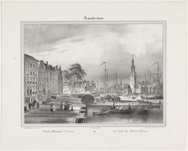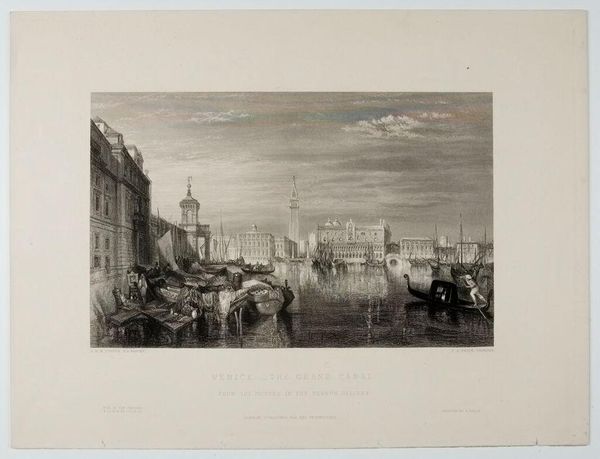 Editor: This is James Duffield Harding's "Somerset House and the Waterloo Bridge from the River." It's a print, and the detail is incredible! What strikes me is how it captures a sense of bustling activity on the Thames. What do you see in this piece? Curator: Beyond the picturesque scene, I see a representation of 19th-century London’s social stratification. The bridge, a symbol of progress, looms over working-class figures in boats. How does Harding portray labor and leisure here? Editor: It's subtle, but the figures in the boats do seem smaller, less defined, compared to the grandeur of Somerset House. Curator: Exactly. The composition implicitly comments on power dynamics. The emerging industrial era reshaped urban spaces, creating visible disparities. Considering this, how does the artwork invite reflection on social justice? Editor: It makes you think about who benefits from progress and who might be left behind. Curator: Precisely. These serene landscapes often mask complex narratives of inequality. Editor: I'll definitely look at landscapes differently now.