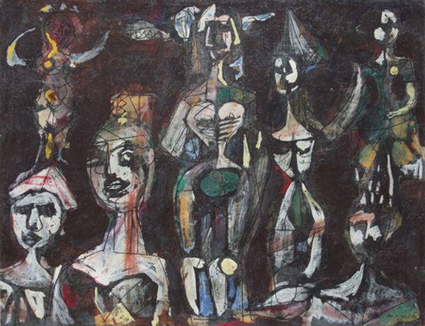 Paul Guiragossian made "Le Mariage" using paint to build an image that embraces flux and change. I love the way the figures emerge from a network of lines and color, like they're in the process of becoming. Looking closely, you can see the physicality of the paint—how the brushstrokes are visible, laying down marks that define the edges of forms, but never quite contain them. It's like he’s inviting the paint to have its own say in the composition. Take the figure in the center, how the lines of color converge, creating a sense of depth and volume, but also dissolving back into the surface. There’s a real tension between representation and abstraction. This piece makes me think of artists like Francis Picabia, who were also playing with figuration and dissolving forms. Ultimately, Guiragossian reminds us that art is about embracing the unresolved and finding beauty in the in-between spaces.