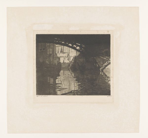 This is Wijnand Otto Jan Nieuwenkamp's etching of the Kwakelbrug in Edam. It's a study in contrasts, framed by the bridge's heavy, textured timbers, which gives way to the airy, light-filled space beyond. Notice how the artist uses line and shadow to guide the eye? The bridge acts as a structural foreground, creating a window onto the tranquil scene of Edam. Nieuwenkamp’s intricate etching technique gives a tactile quality to the buildings and water, while the reflections soften the scene, playing with our perception of depth. The bridge's formal frame introduces a fascinating interplay between architecture and landscape. This composition invites us to consider not just what we are seeing, but how the structure shapes our view, prompting questions about framing, perspective, and the act of observing itself. We see the scene but the frame destabilizes fixed meanings, engaging us in the re-interpretation of art as a space.
