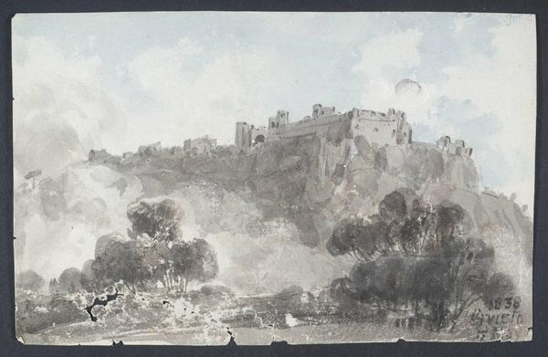 Curator: Here we have "Romantic Castle" by Robert Adam, the famed Scottish neoclassical architect, now part of the Tate Collections. Editor: What strikes me is its haunting quality – almost like a dreamscape rendered in sepia tones. It’s a melancholic beauty. Curator: Adam was deeply influenced by the picturesque movement, emphasizing the beauty of ruins and the sublimity of nature. This work reflects the late 18th-century fascination with the past and the power of landscape. Editor: Exactly! The castle clinging to that crag—it’s both imposing and fragile. Like a memory fading into the mists. I wonder what stories those stones could tell. Curator: Well, Adam designed buildings, but he also shaped our view of them. This work demonstrates how architecture can evoke historical narratives and national identities. Editor: It makes me think about how we build our own castles in our minds, fortified by dreams and nostalgia. A little crumbling, maybe, but beautiful nonetheless. It's a really affecting image. Curator: Yes, a lasting testament to Adam's vision, and the way the past lives on in the present.