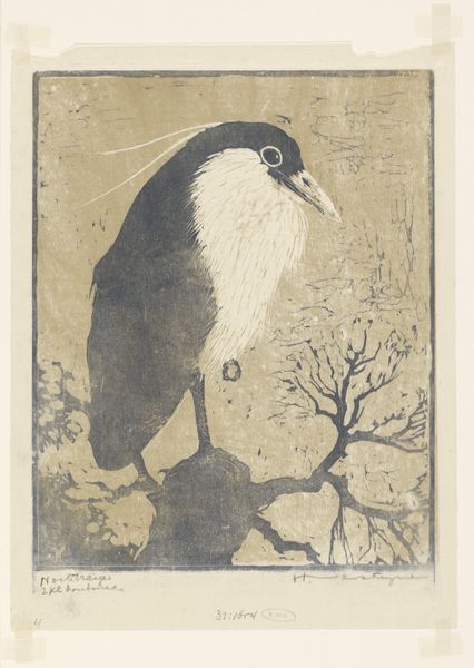 Curator: Jan Mankes' 1917 pen-and-ink sketch, "Nestling," offers a captivating view into a world brimming with intricate detail. Editor: It’s strikingly evocative. The monochromatic palette creates an intense mood. The detailed linework, especially in rendering the bird’s plumage, seems almost tactile, and the density of the textures is superb. Curator: Mankes had a particular fondness for rendering the natural world, particularly in monochrome. Notice how the composition is structured, almost as if the nestling were presented within a proscenium created by the bordering foliage. The negative space around it really draws the eye. Editor: Absolutely. The sharp contrast intensifies the nestling’s presence. It's interesting how the nestling is presented. Rather than depicting a cute, fluffy chick, Mankes captures its ungainly adolescence. Is that realism, or are we supposed to infer something more? I find its gangly legs and awkward stance particularly compelling because they elicit a sense of vulnerability and perhaps even a challenge to traditional ideals of beauty. Curator: Possibly both. It’s a poignant and intimate observation rendered with striking exactitude. Given the cultural and social conditions of Europe at the time, this seemingly innocent study of nature is fraught with notions about innocence and resilience during a cataclysm. Editor: That historical reading definitely layers more profound meaning on the work, viewing the tender depiction as a metaphor for human experience. I keep thinking of it within the broader context of the naturalist movements popular during the early twentieth century, especially concerning art’s ability to offer both commentary on and escape from turbulent events. Curator: It allows for many avenues of appreciation. By understanding "Nestling’s" careful balance of formal composition and socio-political implications, viewers gain insight into its timeless allure. Editor: Precisely. It speaks volumes with minimal means, making the case for nature as an enduring, multi-layered theme of interest.