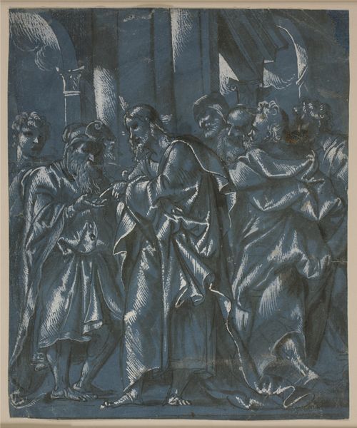 Editor: This drawing, “Toonblokken van Polieukte,” from sometime between 1741 and 1820, by Abraham Delfos at the Rijksmuseum, uses pen and ink on paper. The limited color palette gives it an ethereal, almost dreamlike quality. It reminds me of set design. What draws your eye when you look at it? Curator: It certainly evokes a stage! What seizes me is the curious blend of classical theatricality with a rather intimate sketch-like quality. I imagine Delfos, perhaps after an evening at the theatre, scribbling down impressions, not just of the stage design but of the emotional core of the drama. Notice how the architecture, rendered with these bold, almost brutal lines, frames the figures, pushing them forward, demanding our attention. Editor: Brutal lines, yes, that's interesting! Like architectural ruins holding up something vulnerable? Curator: Precisely! Delfos gives us only the essence, reducing grand narratives to flickering emotions. This wasn't just reportage, was it? But rather a distillation. I feel like I'm peering into Delfos’ mind, catching fragmented reflections of a shared cultural experience. Do you think this makes it more accessible, even though the specific drama is lost to time? Editor: Absolutely. By stripping it down, the universal themes of drama and emotion stand out. Thanks, I feel like I've understood it better now. Curator: My pleasure. These little voyages into an artist’s heart – aren’t they glorious?