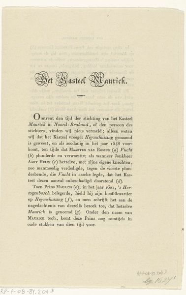 This sheet was printed by C.A. Vieweg in 1629, during the siege of Den Bosch, and is made of paper, an inexpensive yet crucial material for mass communication. The artwork, which speaks of Klooster ten Hage, utilizes the printing press, a technology that had a profound impact on society, allowing for the rapid dissemination of information and ideas. The printed text on this sheet would have been typeset, and it would have taken some labor to produce this. The choice of paper as a medium is particularly significant here, as it enabled the relatively inexpensive production of numerous copies, making the text accessible to a wider audience. This accessibility was crucial during the siege of Den Bosch, when morale and information were vital. The labor that went into the creation and distribution of this printed sheet, while perhaps not immediately apparent, underscores its social significance. It reminds us that every object, even seemingly simple ones, is the result of human effort and skill.