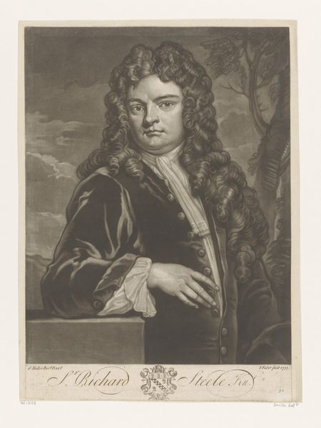 Editor: Here we have "Grinling Gibbons," a print from 1690 after a painting by Sir Godfrey Kneller, housed here at the Metropolitan Museum of Art. It's a striking Baroque portrait; I am really captivated by how the artist's gaze is directed slightly off to the side, as if caught in a moment of inspiration. What visual elements stand out to you the most in this piece? Curator: Immediately, the manipulation of light and shadow commands attention, establishing a dramatic and theatrical atmosphere quintessential to the Baroque style. Observe how the illumination accentuates the textures—the cascading curls of the hair, the smoothness of the sitter's coat—providing visual and tactile contrasts with the roughly carved head below. The lines, meticulously rendered, define form and space, creating an interplay between the figure and the ground. Do you perceive a dialogue established by Kneller between representation and materiality? Editor: I see that now. The rendering of different textures and forms are clearly distinct! Curator: Exactly. The artist uses line and contrast to delineate boundaries while simultaneously blurring the distinction between subject and object, presence and representation. Notice how the textures of skin, fabric, and stone invite touch. The varying lines create a feeling that the subjects are truly 3-dimensional and tactile. How would you say the arrangement influences our reading of the work? Editor: It seems the artist directs us towards the face and bust... maybe hinting that he's a master sculptor? Curator: The placement guides our vision, but consider also the inherent tension within the composition. The corporeal is positioned juxtaposed against a representation of his craft. A formal, almost philosophical enquiry into his practice, presented within a two-dimensional picture plane, made from lines on a page. Editor: I hadn’t considered the relationship between his face and the stone head so abstractly before, just thinking about his skills. It seems, like you said, the texture almost transforms a simple image into something quite thought-provoking! Curator: Precisely. Close attention to the elements and principles can change an entire artwork.
