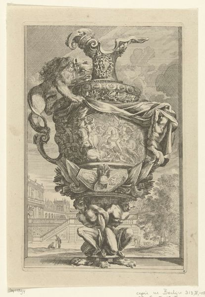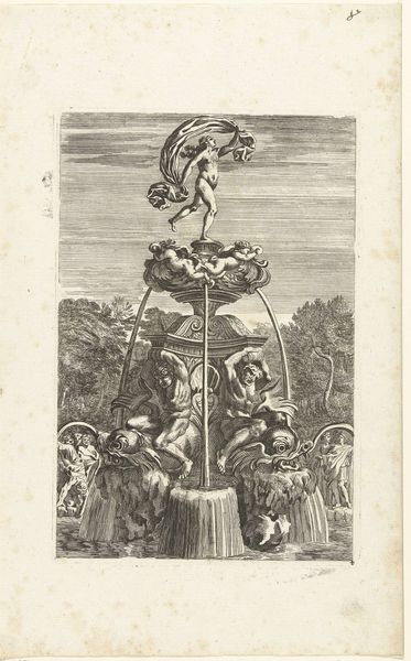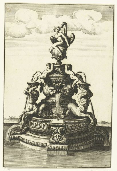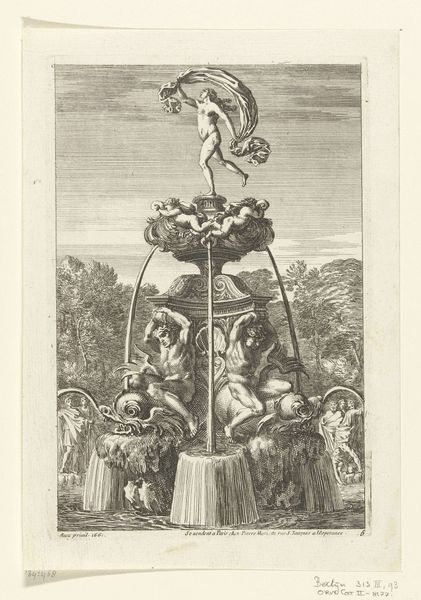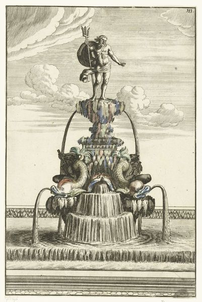 This is an engraving of a fountain with Neptune by Jean Lepautre. The formal arrangement of the fountain’s design draws the eye upwards from the tiered basin to the imposing figure of Neptune, set against a meticulously detailed architectural and garden backdrop. The engraving employs a sophisticated use of line, varying its weight to suggest depth and texture. The cascading water is rendered with fine, parallel strokes, creating a sense of fluid motion. The overall composition is rigorously symmetrical. This symmetry can be seen as reflecting the period's interest in rational order and the control of nature, characteristic of the Baroque aesthetic. Here, the fountain emerges not merely as a source of water, but as a symbolic display of power and artistic control, inviting interpretation within broader discourses of art, nature, and authority.