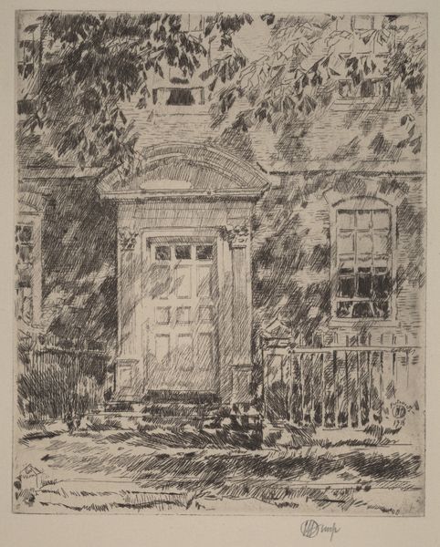 Curator: What a haunting little glimpse! Jan van Essen’s drawing, "Buitenhuis tussen bomen," which roughly translates to "Country House Between Trees," beckons from… well, sometime between 1864 and 1936. Editor: It does feel spectral. The bare trees clawing at the sky, that pale house…it's like a memory surfacing. The texture gives a raw intimacy to the drawing. Curator: Indeed. Van Essen’s work, often focusing on cityscapes, really captures the feeling of that time. Drawn in pencil and pen, it’s that liminal space, I think, between wildness and cultivation—a house stubbornly holding onto order while nature threatens to swallow it whole. Editor: I think you have a point! But it almost has a quiet rebellion embedded within it, almost whispering stories about what life must've been like back then. It is really up to the eye of the beholder! Curator: In its subdued tones, I can imagine it challenging the period’s obsession with idealized rural scenes. But also thinking about the cultural context. This almost sketch-like quality makes you think: Was it just that a captured fleeting moment or just someone experimenting with shapes and ideas? Editor: Possibly! I guess there's beauty even in incomplete attempts or unfinished things. If you go beyond a first impression, you almost get the gist of the era as he lived it. And there are parts of that drawing that suggest comfort in repetition but I don't think it should be read necessarily with nostalgic reverence. Curator: Absolutely, it transcends nostalgia! By inviting people to experience it using the cultural lens from which Van Essen created "Buitenhuis tussen bomen" from his personal experiences as a reference! The fact that we get to glimpse through this intimate picture in time. Editor: Exactly! Let’s leave our listeners to ponder that image of balance, and impermanence, then. Thank you!