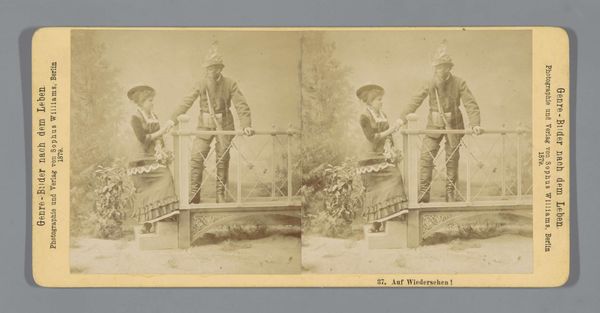 Editor: This albumen print from 1879 by Sophus Williams, titled "Man en vrouw op een brug," shows a man and woman posed on a bridge. I’m struck by the theatrical quality, like a staged scene from a play. What cultural narratives do you think this work is engaging with? Curator: It’s interesting you mention the theatricality. Indeed, photographs from this era often adopted conventions of painting and theatre. This piece speaks to several important socio-political trends of the late 19th century. What do you notice about the man's attire? Editor: He appears to be in some kind of uniform, perhaps military? Curator: Exactly. We must consider the growing militarization of European society at this time, and the way military service was increasingly valorized in national identity. The woman, then, represents a certain ideal of femininity, perhaps awaiting her soldier's return. This tableau is, in a way, manufacturing consent for that militaristic posture, don’t you think? How might this photograph have been displayed, consumed? Editor: Likely in a home, as a signifier of patriotic virtue, maybe? It feels so formal, like they’re acting out a specific role. It's fascinating to see how photography, even then, participated in shaping societal expectations. Curator: Precisely. And, given the photographer’s business likely catered to a specific clientele, understanding that market helps contextualize the work's intent. What could otherwise be seen as a charming, genre-painting image reflects deeper cultural messaging at play. Editor: It definitely shifts the way I see it – I'll remember to always consider how an image is shaped by political powers! Thanks!