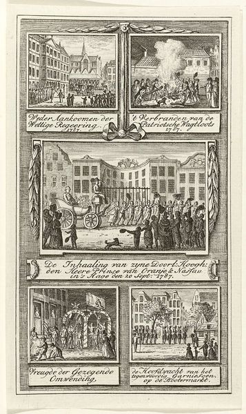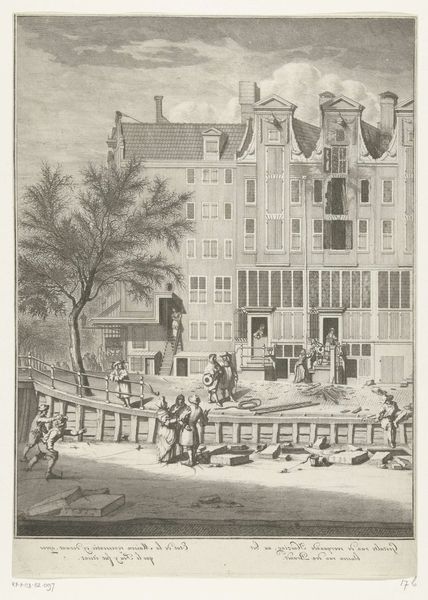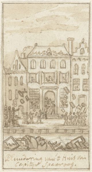 Curator: This is a print made between 1779 and 1781 by Simon Fokke titled, "Plundering van het huis van kapitein Spaaroog tijdens het Aansprekersoproer te Amsterdam, 1696," depicting the sack of Captain Spaaroog’s house during the Undertakers' Riot in Amsterdam. Editor: It’s chaos! The scene bursts with figures flinging objects from windows. The dense, cross-hatched lines amplify the sense of upheaval. I notice the detailed rendering of architecture juxtaposed against the raw energy of the crowd. Curator: Indeed. This engraving provides a visual record of a specific moment in Amsterdam's social and political history. The Aansprekersoproer, or Undertakers' Riot, was triggered by resentment towards the undertakers' guild and their perceived exploitation of funeral practices. Fokke's rendering immortalizes the public's rage. Editor: And look at the building materials almost bursting. You get a sense of the economic conditions through the portrayal of not only the wealthy Spaaroog residence, but also the tools, clothing and objects flying out the windows and across the water – you sense how goods circulated and the tension that existed for some around issues of economic opportunity. Curator: Precisely. The act of plundering isn't simply about theft; it's a redistribution of wealth, a challenge to the existing power structures, and highlights the historical struggles around social and economic disparity. Whose labour allowed for these riches in the first place? Editor: Also, how the very technique of printmaking democratized the spread of information. By using engraving, it’s meant to be consumed by a mass audience – it gives this historical moment a longevity, in some ways memorializing and making monumental this moment of upheaval. Curator: Absolutely. Consider the ways in which history is made and remade through this type of visual medium. It immortalizes those tensions, even canonizes resistance in ways that should provoke analysis. Editor: Seeing this print, I am reminded of how important it is to examine the making of historical moments and the impact of materials on its lasting legacy. Curator: For me, this print reminds us how crucial it is to investigate art in its socio-political environment, understanding its capacity to reveal not just the story itself, but to consider whose stories go untold, particularly in moments of strife and resistance.
