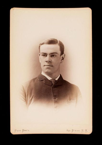 Curator: Here we have an untitled portrait, attributed to the Pach Brothers. It depicts a man identified as Charles Gaston Smith. Editor: The sepia tones and the crispness of the image give it an austere yet intimate quality. Curator: Indeed. The photograph's format, a mounted print of modest dimensions, speaks to its origins as a commercial product of late 19th or early 20th century portraiture. Editor: The Pach Brothers were known for their studio work. Looking at the textures – the matte surface of the print itself and the way light plays on the man's suit – one thinks about the physical labor involved in making these images. Curator: The subject's gaze, slightly averted, lends itself to speculation about the narrative implied by his pose. The composition is quite classic. Editor: It highlights the process, the studio, the choices made. It's a simple image, yet filled with information about its time. Curator: Precisely, a confluence of material and form. Editor: I appreciate how it connects us to that period.