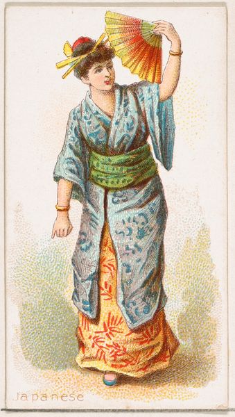 The Kinney Brothers Tobacco Company produced this small lithograph titled "Flower Dance" as part of a series around 1888. These were included in cigarette packs to stiffen them and entice customers. The image depicts a woman in what is meant to be traditional Japanese dress, complete with a kimono, obi, and stylized hair. She holds a fan and flowers while posed in mid-dance. This card comes from a time of increasing cultural exchange, but also a pervasive exoticism. How does the image reflect genuine cultural appreciation versus commercial exploitation? To understand this artwork, it is useful to explore archival business records, analyze marketing strategies, and consider the social appetite for exotic images during the late 19th century. Looking at "Flower Dance" in its historical context allows us to reflect on how cultural imagery can be both a bridge between societies and a tool for capitalist gains.
