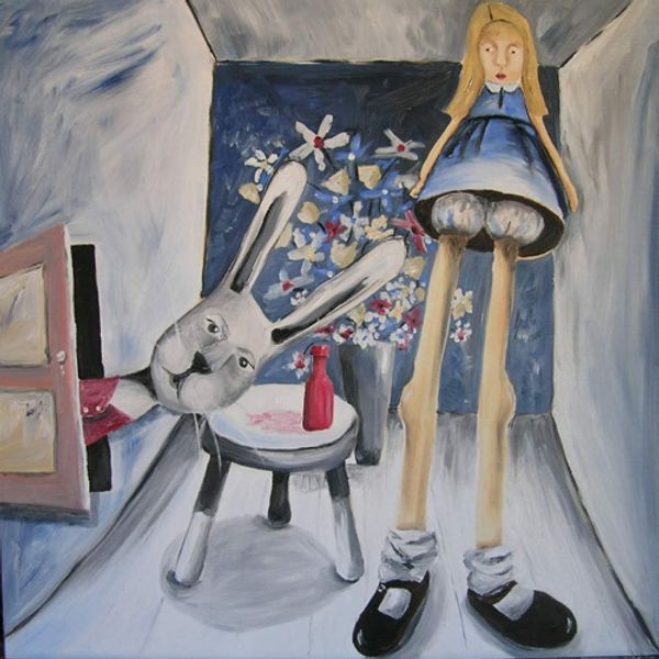 Troy Brooks' "Jezebel" presents us with an oil painting of a slender woman in a vivid red dress, a composition dominated by a stark contrast between the figure and the ethereal, almost clinical setting. The smoothness of the dress contrasts with the rich texture of the white rug, a tension that draws the eye and sets the stage for a compelling visual narrative. The stark white of the room, punctuated by the imposing white door and hints of ghostly hands, lends itself to a semiotic reading of purity versus desire. The woman, with her elongated neck and towering white hair, borders on the surreal, as if Brooks is pushing the boundaries of conventional beauty standards. She's an enigmatic figure, a signifier of a mysterious story, and Brooks uses these elements to challenge our perceptions and invite us to question the meanings we ascribe to them. Consider the function of that crimson dress—a bold splash that disrupts the monochrome, almost daring us to decipher its place in the larger composition. Here, Brooks plays with form and color to pose questions about narrative and identity, leaving us to our own interpretations within this carefully constructed tableau.