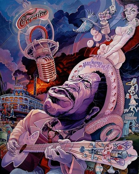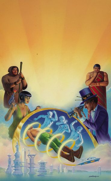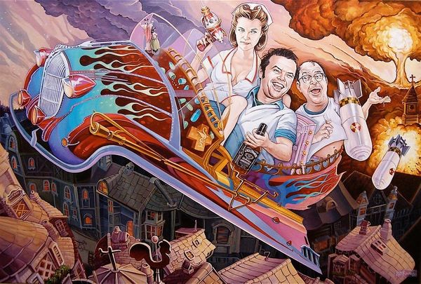 Curator: Welcome. We are looking at Dave Macdowell's 2015 piece, "The Wizard Coz", an acrylic on canvas. Editor: It's striking. The immediate sense I get is of surreal unease mixed with almost satirical commentary on the 'Wizard of Oz'. The sheer scale of the looming face dominating the composition is unsettling. Curator: Absolutely. Macdowell is known for his pop-surrealist style, often using recognizable imagery to critique cultural phenomena. This painting blends "The Wizard of Oz" with a clear, contemporary social allegory. Look at the path before Dorothy and her friends. Editor: Yes, it's scattered with what appear to be pills or capsules. The ruby slippers, a symbol of home and belonging in the original story, feel almost tainted by this environment of what appears to be dependence on a substance. Curator: Precisely. The pills might signify an over-reliance on pharmaceuticals, perhaps referencing addiction or the numbing effect of contemporary society. Macdowell uses "Oz" as a framework to explore the illusions offered by contemporary systems. Consider the material itself; acrylic, quick-drying and versatile. Mass produced. Editor: It lends a flattened quality to the images. Note how Macdowell uses this flatness. The portrait of the face is rather crude in its detail when you consider the precision of the characters from the back. It creates a jarring contrast, further heightening the surreal quality. The material feels relevant. The painting mimics artifice through form and construction. Curator: It is a commentary on the manufactured nature of the ‘wizard’ figure. We, as viewers, are implicated. Editor: What I appreciate about Macdowell's piece is the ambiguity it holds. It invites scrutiny of the very process of myth-making, particularly in the context of commercialization and cultural symbols. It pushes me to reflect on artifice versus authenticity, not just in art, but in everyday life. Curator: Indeed. It's a compelling engagement with the social function of symbols. This encourages an analysis of not just "what" is represented, but "how" the representation affects the audience's engagement with contemporary anxieties about dependence. Editor: A thought-provoking piece of work that remains with you long after you move on. Curator: Very much so. Thanks for joining us.