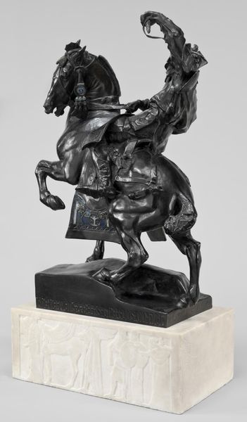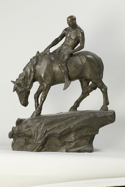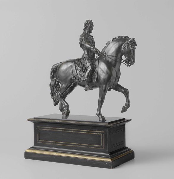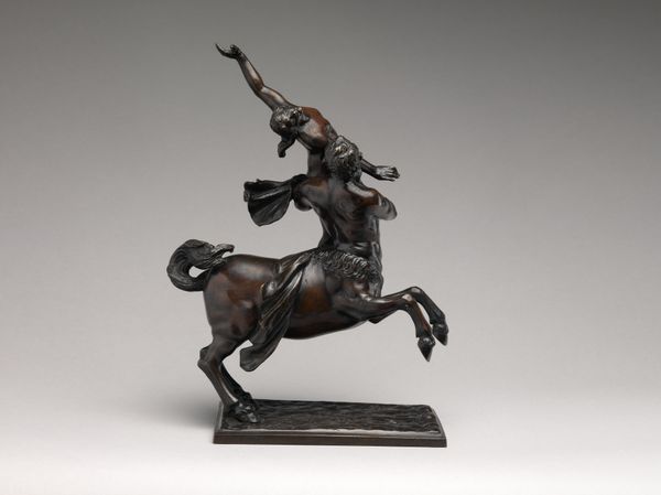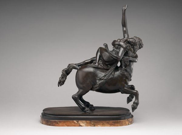 Editor: This bronze sculpture, titled "Nessus abducting Deianeira," believed to have been made sometime between 1640 and 1800 by Caspar Gras, really captures a sense of frantic motion, doesn’t it? The way Deianeira is reaching upwards suggests struggle. What sort of story is being told here? Curator: Indeed, it is all about power dynamics! Consider the centaur, Nessus. He's not merely transporting Deianeira; he's 'abducting' her. The sculpture becomes a potent symbol of masculine power and the vulnerability of women, prevalent themes visualized and consumed within a society grappling with its own hierarchical structures. Where would a piece like this be displayed, and what does that say about who it was meant for? Editor: It feels almost staged, doesn’t it? I can imagine it displayed in a wealthy collector’s home… How does knowing this would be a decorative piece alter how we perceive its original context? Curator: Precisely! Display context radically alters our perception. Commissioned by the elite, perhaps to flaunt their access to classical themes and superior status? It transforms the scene into a status symbol, divorced somewhat from the raw emotionality of the myth itself. We must acknowledge how such art reinforced and naturalized social stratifications. Notice how even Deianeira's pose becomes an objectified display, rather than purely a portrayal of suffering. Editor: So, we’re not just looking at a mythological scene but also a carefully crafted statement about social standing at the time it was displayed? Curator: Absolutely! Understanding the societal conditions enables us to decipher beyond the artistic mastery. The statue gives voice to gendered ideas, and, ultimately, speaks volumes about the period’s value system. It is quite sobering when viewed with today's awareness. Editor: It certainly changes how I see it. I guess art is rarely just “art” then. Curator: Indeed, every artwork carries a story far deeper than what's visible to the casual eye!