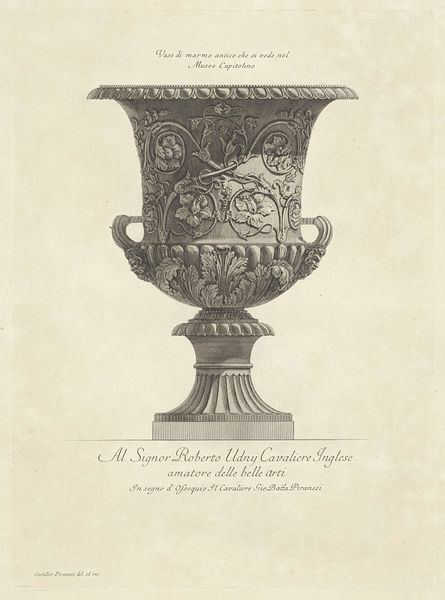 Curator: Here we have a print titled "Antieke vaak," which translates to "Antique Vase," dating back to 1778, crafted by Giovanni Battista Piranesi. Editor: My first impression? Overwhelmingly ornate. Every surface seems to be teeming with detail—vines, masks, even those tiny loops I don’t know what to call! It feels…theatrical, almost a stage prop. Curator: Piranesi was deeply immersed in neoclassicism, drawing inspiration from classical forms, but he also questioned and transformed them. The inscription on the print is dedicated to Roberto Udny, an English Knight and patron of the arts, suggesting a dialogue between Italian and British aristocratic taste. Editor: Absolutely, there's a British sense of grandeur… though perhaps through an Italian lens? Those decorative arts served to reinforce power, prestige... but the vase itself, what could it possibly have held? Dreams? Ashes? A terrible salad? Curator: Well, it reflects the 18th-century obsession with antiquity and the Grand Tour, where wealthy Europeans acquired art and artifacts as symbols of their cultural sophistication. This vase embodies the ideal of returning to an imagined golden age of classical perfection—an ideology ripe for critique. It suggests a linear progression narrative where classicism sits at the pinnacle of Western art. Editor: A bit stuffy for my taste if I'm being honest, all that pomp can hide more than it reveals, and this ideal golden age tends to erase those left out. I imagine that detail that looks like small loops is egg-and-dart decor. I imagine how heavy this marble vase would be! And think of the sculptor's touch, tracing every little groove, carving out a lion's mane one detail at a time. All of it rendered so meticulously into a single print! It really showcases incredible artistic control, despite how not very 'rebellious' the style might appear to a contemporary viewer. Curator: Precisely. Analyzing its representation as a print invites interrogation into how historical narratives are constructed and consumed. The artwork acts as a potent marker of class and cultural authority. Editor: Definitely food for thought, all the labor involved to serve the one percent of the eighteenth century, I have gained a new found appreciation. Now, looking at the dark lines mimicking shadow, this engraving really captures texture... quite clever. Curator: A testament to the layered historical meanings that objects—even images of objects—carry and communicate across time. Editor: Indeed! And maybe a reminder not to underestimate what vases whisper to us…if only we dare listen.