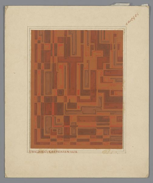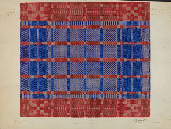 Editor: Here we have "Coverlet (Section)" created around 1940 by Cornelius Christoffels. It seems to be a drawing on paper, maybe with pencil. I'm immediately struck by its rigid geometry. What is it that you see? Curator: A study in heritage and hope. The geometric pattern acts as a symbolic language, echoing traditions embedded in woven textiles. We see the cultural memory encoded within each intersection. The repetition soothes. Editor: Do you mean like a visual echo of the past? Curator: Precisely. Think of a community's collective experience being passed down. The careful drawing with pencil conveys devotion to preserving culture. Each tiny mark resonates with dedication and intention. Do the red and blue colours evoke particular emotions in you? Editor: Definitely a feeling of warmth, the red specifically gives me comfort. It seems so painstakingly rendered, especially to make a study, it's unexpected! Curator: Yes, there is beauty to the devotion here! It points towards psychological investment, perhaps the artist hoped for cultural survival and continuity. The grid structure can itself represent order but also confinement. It makes one wonder, what was Cornelius Christoffels thinking when he drew this? Editor: That gives me so much to think about. It's not just a pretty pattern; it's a link to cultural memory. Curator: Indeed. The drawing of "Coverlet (Section)" encapsulates the lasting legacy of visual symbols within the human psyche, a blend of comfort, constraint, and cultural endurance.