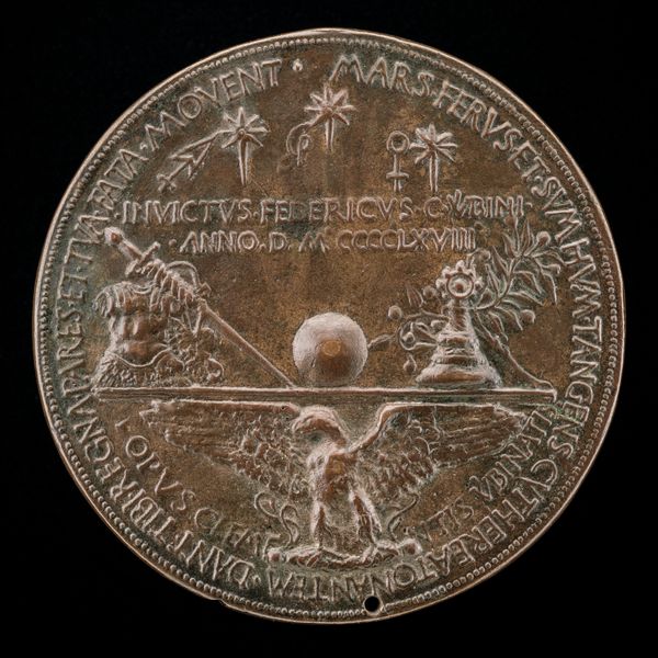 Editor: So, this metal relief is a portrait of Conrad Peutinger, a Humanist and Antiquarian, created in 1527 by Friedrich Hagenauer. It’s interesting how a material like metal can capture someone's likeness with such detail, but it's got me wondering about the time and labor put into this; what does that labor contribute to our understanding of it? Curator: A great question! The medal form, rendered in metal, immediately speaks to status and permanence, right? Think about the social context. This wasn't mass-produced. Hagenauer likely worked directly with Peutinger, or someone of his status, under his employment. Editor: Exactly, you can almost feel the exchange of wealth for labour in its material presence, something that you lose with mass production. Is the metal itself symbolic in any way? Curator: Absolutely. The choice of metal wasn't arbitrary. Precious metals would indicate substantial wealth and a patron willing to invest in a lasting image, linking him to the power and authority. Who got to decide to commission that image, and who were these items available for? These objects served to elevate individuals within that system. Do you notice how the inscriptions also play a role in establishing him? Editor: They do. The text memorializes him, in a way. How does this production reflect the shift away from the old religious models toward a model of individual humanism? Curator: This portrait medal reflects the rising prominence of individuals through their accomplishments and intellectual pursuits during the Renaissance. By producing images of people like this, artists provided these upper echelons with a means of communicating their ideals through material objects. Hagenauer's artistry literally lends weight to Peutinger's persona through his mastery of the medium. Editor: Fascinating. Considering the process and the cultural context behind the relief gives so much more perspective on the object itself. I had just assumed the choice of material was arbitrary.