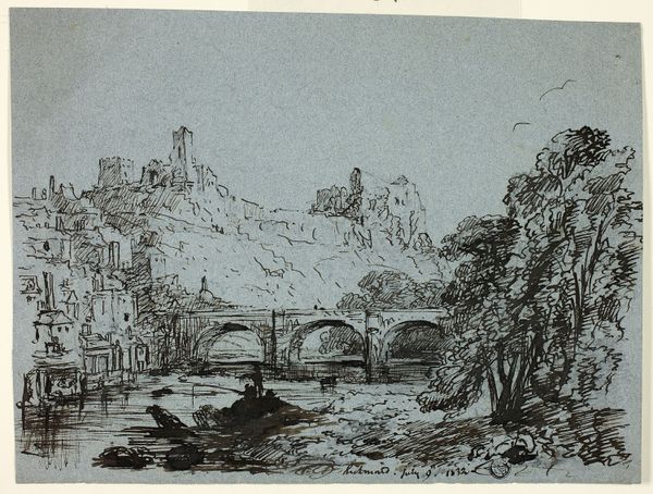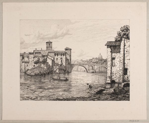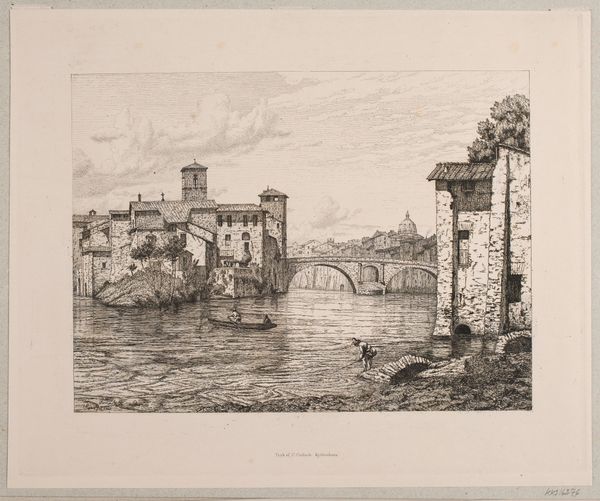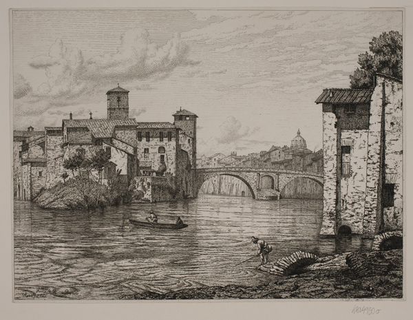 Vilhelm Kyhn made this print of a scene on the Ponte Rotto in Rome. The printmaking process, etching, emphasizes line and detail. An etcher covers a metal plate with a waxy ground, then scratches an image into it with a needle before bathing the plate in acid. The acid bites into the exposed metal, creating recessed lines that hold ink. The plate is then wiped clean, inked, and pressed onto paper to transfer the image. Here, this process allows for intricate depictions of the stone buildings, the flowing water, and the figures engaged in daily life. The precision of the etched lines captures the texture of the stone and the reflections on the water, while the overall composition conveys a sense of place and atmosphere. The choice of printmaking speaks to Kyhn's interest in making art accessible and reproducible. Prints could be widely distributed, making art available to a broader audience. The labor-intensive process of etching is here put to the service of circulating images and ideas. Ultimately, it reminds us that art is always shaped by the materials and processes used to create it.