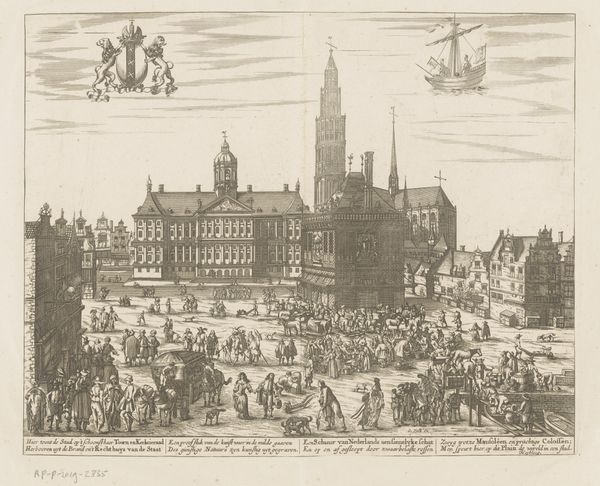 Editor: This is Leonard Schenk's "Gezicht van de Groote Markt te Delft," an engraving that experts date anywhere between 1706 and 1767. The precision in the rendering of architectural forms and the bustling scene gives it a sense of liveliness, yet there’s a certain static quality too, wouldn’t you say? What compositional choices strike you as significant in this piece? Curator: The meticulous rendering, precisely because of its detail, almost freezes the dynamic possibility of the market square. Observe how Schenk utilizes linear perspective; the orthogonals converge at a vanishing point, reinforcing a sense of depth, but simultaneously creating a highly structured and somewhat artificial space. It’s less a window onto the world, and more a constructed visual experience. Editor: Constructed? How so? Curator: Notice the uniformity in the execution. The rendering of light and shadow is consistent, yet feels…unnatural. This evenness flattens the forms. Then there's the aerial perspective, rendered as a graphic convention, rather than atmospheric reality. Everything is equally sharp, defying how we naturally perceive space. Editor: I see what you mean! So, the artifice is created through these strategic visual choices, pushing it beyond a simple document. Does that impact how we see the Great Market? Curator: Absolutely. Schenk emphasizes design over direct representation. He wants to underscore the order and implied prosperity of Delft. Through formal strategies—perspective, even lighting, controlled details—Schenk constructs an ideal Delft, a visually ordered spectacle of commerce. Editor: It's like he's staging the scene rather than just capturing it! I never considered engravings this way, focusing so much on what the choices *create*, not just what they depict. Thanks! Curator: Indeed! Looking past immediate representation reveals the very artistic architecture of its construction, altering how one views cityscapes.