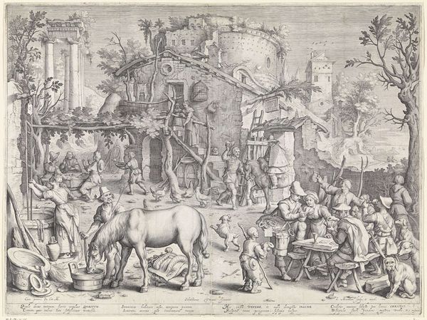 Editor: This is "The Blue Cloak," an engraving by Frans Hogenberg from around 1556-1560, housed here at the Rijksmuseum. It’s so packed with figures, it's almost overwhelming! What strikes me most is how it seems to depict chaos and perhaps societal failings. How do you interpret this work? Curator: Indeed, its complexity speaks volumes. Looking at it through a historical lens, we see more than just chaos; we see a commentary on societal behaviors, particularly those considered foolish or misguided. It's a print, intended for wide distribution. Do you think that affects its message? Editor: I hadn’t thought of that, but of course! Being widely distributed means it’s meant to reach and influence a broad audience. So, what specific "follies" is Hogenberg highlighting? Curator: Note how different segments of the population, identified by their dress and activity, engage in absurd or self-destructive behavior. The figures engage in actions that go against reason. It challenges us to consider who is shaping public morality, and what happens when those figures lack integrity or judgement. Consider also that it was produced amidst the religious and political turmoil of the Reformation; could the artwork have to do with religious failings of the time? Editor: That context really sheds new light on the imagery. It isn’t just random chaos but a deliberate critique aimed at a specific societal moment. So, it served a public, almost journalistic function? Curator: Precisely! It reflects a world turned upside down and served to call for change. What's striking is how those critiques can translate through the centuries. Editor: I see it now: this engraving acted as a form of social and political critique, easily disseminated, engaging viewers in a debate about proper conduct and leadership. Thank you for highlighting the nuances and reminding me that it needs to be appreciated through history. Curator: My pleasure. Looking at art within its historical context can provide so many entry points into appreciating it.