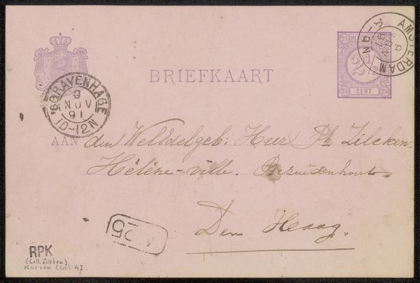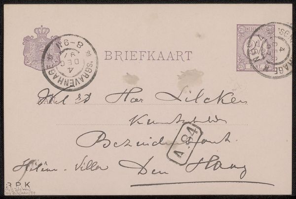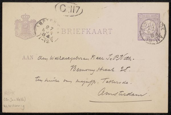This is a postcard to Jan Veth, written by Willem Witsen, in Amsterdam in 1884. The Netherlands in the late 19th century was a society undergoing rapid modernisation, with a growing art world that was defining itself against the backdrop of traditional artistic values. The image speaks to the development of postal systems and the rise of mass communication in the late 19th century. Note the stamps, the postmarks, and the printed word "BRIEFKAART." These all point to a society that was becoming increasingly interconnected. The handwritten address and signature, remind us that this was still a world of personal connections, and that the art world relied on these networks. The Rijksmuseum would have collected this as an example of the everyday visual culture of the time. To fully understand this image, we might consult postal archives, art world biographies, and historical studies of communication technologies. Only by considering the social and institutional contexts can we fully appreciate the meaning of this humble postcard.