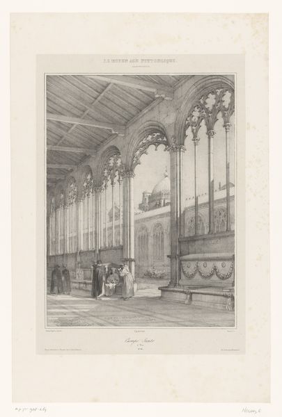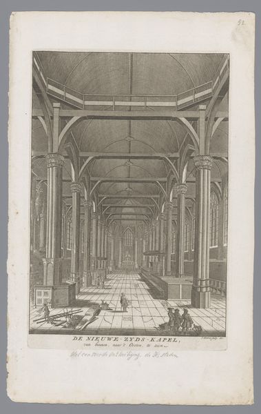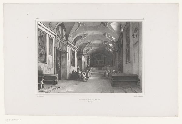 Curator: The Rijksmuseum holds this detailed print, titled "Interieur van de Wasserkirche te Zürich, 1715", made by Franz Hegi in 1848 using etching and engraving. Editor: Immediately, the scale jumps out at me. That exaggerated perspective dwarfs the figures; the books recede into infinity! What symbols were they hoping to convey? Curator: The architecture itself is hugely symbolic. The Wasserkirche, despite its name meaning "water church," actually has pagan origins, connected to Roman baths and purported executions of Zurich's patron saints. Think about Hegi returning to that visual history in the 19th century, during a period of social upheaval and industrial shifts. Editor: I see columns resembling a classical temple mixed with what feels like late gothic arches – fascinating visual echoes that tie the religious, the historical, and the literary together. The way the people congregate reminds me a bit of an annunciation scene—is that panel at the far end an altar piece? Curator: Maybe. Hegi wasn’t just concerned with religious connotations. Etching and engraving were themselves means of mass production, which allowed such interior scenes—previously exclusive to the wealthy—to reach a wider audience. We need to think about how Hegi’s choice of this *particular* architecture coincided with this growth in print culture. Editor: It speaks volumes. That panel at the far end is framed by an arch supported by more classical columns, like a portal into a past they could only see filtered through their inherited architectural and religious visual language. The people grouped in front of it could be interpreted as searching for guidance. Curator: Right, these interiors create and sell accessible and sanitized images of these historically contested locations to new classes of consumers, literally producing access through distribution of new techniques and aesthetic sensibilities. Editor: This image resonates beyond just documentation; the composition and perspective make this a stage of inherited traditions and the architecture itself has an emotional charge to it, telling many stories simultaneously. Curator: Yes. Seeing the ways he combines both the past and the possibilities of its era deepens the narrative and highlights how closely culture and context are entwined, giving insight into production methods, technological distribution, and aesthetics during that pivotal moment in European history.