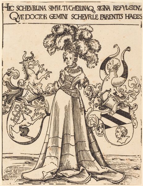 Lucas Cranach the Elder made this print of St. Barbara sometime in the early 16th century, using the technique of woodcut. Here, the artist cuts away the areas that he doesn't want to print, leaving a raised image that is then inked and pressed onto paper. Notice how the lines are bold and graphic, giving the image a strong sense of contrast. The process relies on the steady hand of the artist, using a knife to carefully carve away the wood. Cranach's skill is evident in the intricate details of St. Barbara's dress and the landscape behind her. Woodcut was a relatively accessible medium, allowing for the production of multiple prints at a lower cost compared to other art forms. The texture of the wood grain is also visible in the print, adding another layer of visual interest. The image, therefore, is not just a representation, but an index of human labour and of the materials with which that labour was achieved.