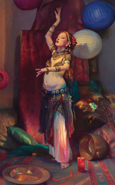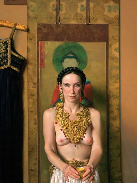 Editor: This is Nelson Shanks’s "Flora," painted in 1994, oil on canvas. The warmth in the palette combined with the slightly unsettling direct gaze makes the piece incredibly captivating. What stands out to you? Curator: Oh, this portrait just shimmers with so many potential narratives, doesn't it? It feels like a Renaissance painting collided head-on with modern sensibilities, creating a beautiful enigma. The soft light, the adornments… they’re not merely decorative. That headdress! I'm thinking, what happens when we see echoes of Botticelli's goddesses in the late 20th century? Editor: So, the reference to Renaissance imagery changes how you view the portrait? Curator: Absolutely. It shifts the frame of reference. It encourages you to decode, almost like Shanks is presenting Flora as both timeless archetype and an individual woman anchored in her time. See how the shadows play? The textures of the flowers contrast with skin and that reflective jewelry! It feels almost deliberately destabilizing. Editor: Destabilizing… that's an interesting choice of words. It definitely has an off-kilter mood to it. Curator: In the best possible way, darling. Isn’t art supposed to get under our skin a little? Maybe make us question the pretty, idealized images we take for granted? The gaze follows me; I find myself almost wondering if she's challenging the viewer as much as she is being observed by them. It invites us to challenge that tradition, maybe? What do *you* think? Editor: That makes sense. It's definitely stuck with me. It's more than just pretty – there is substance, and something worth pondering here. Curator: Precisely. It lingers, doesn’t it? Art isn't always about answers, sometimes it’s just about those delicious, beautiful, unsettling questions.