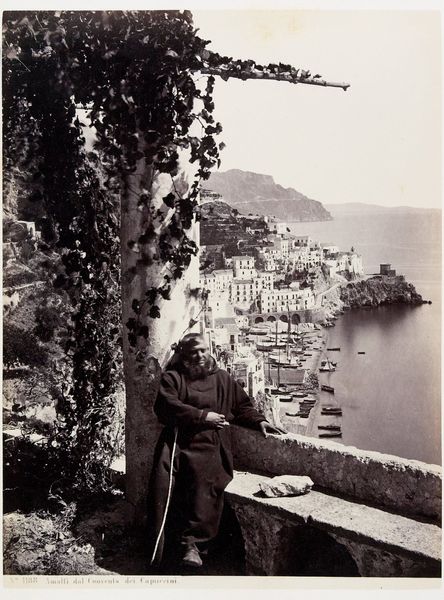 Curator: What a wonderfully serene image. I am drawn to the sense of peaceful contemplation. Editor: Yes, there's definitely a contemplative air about it. This is "Amalfi," an albumen print photograph created by Giorgio Sommer, likely sometime between 1888 and 1903. The Rijksmuseum holds this print in their collection. Curator: Thank you, that helps situate us in the historical context. For me, the key figure here is the monk. It begs so many questions, doesn't it? Who was he, what's his story, what’s his relationship to the depicted site? How does he perceive his relation with this landscape? His solitary presence set against the dramatic vista prompts an exploration of identity, faith, and perhaps even an unconscious desire. Editor: Absolutely. And it speaks volumes about the social and political context of that period. Photography like this played a significant role in shaping perceptions of place and cultural identity, contributing to how Amalfi and Southern Italy were seen at the time. This romantic image taps into both the Grand Tour tradition and also to orientalist perceptions of a life lived under an assumed spiritual calm. Curator: The positioning of the monk is striking. Leaning on the wall of the terrace, overlooking the sea—there is a kind of active observation in stillness here, almost melancholic…It speaks volumes about power dynamics too—who has access to these breathtaking views, and who is capturing them for broader consumption? Editor: It brings up some very real tensions—access, tourism, even colonial undertones are at play in the representation of this landscape. What is not represented? Sommer does not focus on labour; and so presents the scene without necessary reference to a system that grants some time and leisured contemplation in nature. We also have to remember the institutional power behind what and how such images were made. Sommer had relationships with museums; this work would circulate into various publics who were shaped to regard Italy and its inhabitants in a certain fashion. Curator: It definitely seems an attempt to romanticise Italian monastic orders. By overlooking labour and portraying only its most "spiritual" agents, he seems to grant dignity to the subjects—though ultimately, at a distance. That's quite problematic given Italy's history. Editor: Indeed. And in that light, the image opens to interpretations around tourism, privilege, and the selective framing of a specific cultural narrative. I wonder, if presented this scene to contemporary communities in Southern Italy, what would be their first reading. Curator: An interesting question that shows how the legacy of images continues resonating today and influencing socio-cultural discussions across boundaries. Editor: Precisely, and remembering that keeps such dialogue relevant to the politics of visuality.