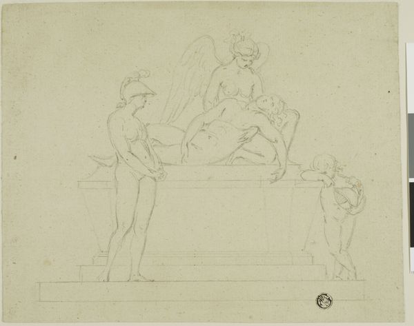 Curator: Before us, we have Peter Cornelius’s drawing, circa 1810, "Virtus schreibt den Namen Karls auf den Schild der Stadt Frankfurt_Entwurf f\u00fcr ein Denkmal f\u00fcr Karl von Dalberg," now held at the St\u00e4del Museum. Editor: It’s stark. The spareness of line gives it a raw, immediate feel, almost as if we're privy to the very moment of its creation. The figures feel…unfinished, exposed. Curator: The drawing serves as a study, intended as the model for a monument dedicated to Karl von Dalberg, Archbishop-Elector of Mainz. It deploys neoclassicism, imbuing political themes within the visual language of allegory. Think about the post-revolutionary fervor in Germany at the time. Editor: Right, neoclassicism functioned as this visual echo of the Roman Republic, but why wrap Dalberg in this aesthetic? I'm especially drawn to the central female figure of Virtus herself, so rigidly idealized, her crown like some austere civic building. Who do you imagine her to be and is there significance behind her stern gaze and positioning in the artwork? Curator: As an embodiment of civic virtue, Virtus underscores the supposed ideal leadership. Cornelius is employing potent symbolism of renewal here. The two flanking putti represent historical narrative versus nascent identity in this particular German landscape. Notice the tablet in which “Carl” is writ. Editor: Indeed, the choice of inscription style is very Roman. These cherubic figures seem trapped between that past, which we know to be an imagined, aestheticized ideal, and the real, modern landscape around them. Also note the use of classical-realism to really solidify those themes visually. Curator: The tension, of course, lies in the real implications of celebrating such figures. Karl von Dalberg was very controversial, due to the complex social and political narratives that shaped his leadership style. Editor: The weight of historical context adds to the drama in this image. Viewing the image anew, I now detect subtle shadows which deepen and complicate its narrative thrust, creating a stark but fascinating visual experience. Curator: Yes, it speaks volumes about power, identity, and representation through the language of its era. It reminds us to consider how history shapes our understanding of art. Editor: Definitely, I can see how art like this operates as both a reflection of and a shaper of cultural values. It helps reveal collective desires, anxieties, and aspirations embedded within past and present ideologies.