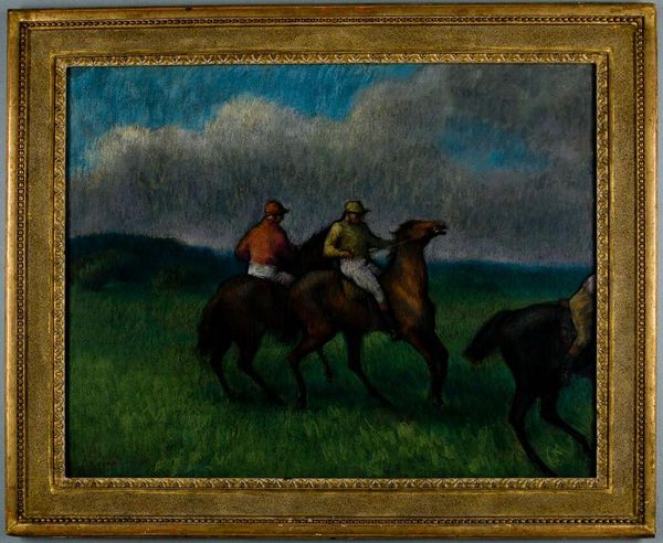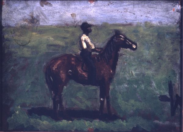 Thomas Eakins created this oil on board sketch for Cowboys in the Badlands. The subdued palette and loose brushwork create an impression of a hazy, expansive landscape. The composition, dominated by horizontal lines, enhances the sense of breadth and movement. Eakins was interested in realism, and this sketch captures a moment in the daily lives of cowboys. Eakins' approach goes beyond mere depiction. By rendering forms with a muted palette, he destabilizes the romantic ideal of the Wild West, presenting it as an everyday landscape marked by labor. Consider the materiality of the paint, the visible brushstrokes, and the open composition. These formal qualities invite us to reflect on how the process of representation shapes our understanding. This sketch prompts us to reconsider the iconic imagery of the American West through its structure and form.