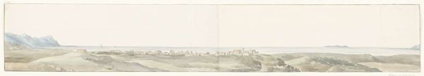 Editor: This is "Haven van Brindisi" by Louis Ducros, made in 1778. It’s a watercolor and drawing. The long, thin format really emphasizes the horizontal, and there’s something so peaceful and still about the whole scene. What stands out to you? Curator: Well, Ducros was working during a fascinating period. Neoclassicism was dominant, but there was also a growing interest in the direct observation of nature. This piece strikes me as an early example of *plein air* painting, prioritizing a naturalistic rendering of light and atmosphere, something that would gain prominence later with the Impressionists. It’s interesting to think about why artists began working this way at that particular moment. Any thoughts on what motivated this shift in approach? Editor: Maybe it was connected to a broader societal interest in science and empiricism, valuing firsthand experience over idealized forms? Curator: Precisely! Also, the Grand Tour was popular at this time. Aristocrats visited Italy and other places, creating a market for landscape paintings like this. Ducros probably catered to that audience. Were these images purely aesthetic, or were they performing a social function? Editor: That's a good question! I suppose these images also played a role in constructing an idea of Italy, then. This feels almost like a visual record…or propaganda! Curator: Indeed. Remember, visual representations are never neutral. Thinking about the image as a kind of cultural commodity helps to understand its significance beyond the purely artistic realm. Editor: Wow, I never thought of landscape paintings in that way. It’s more than just pretty scenery. Curator: Exactly! It’s a reflection of the complex interactions between artistic practice, social values, and economic forces. Editor: I'll definitely be looking at landscapes differently now. Thank you!