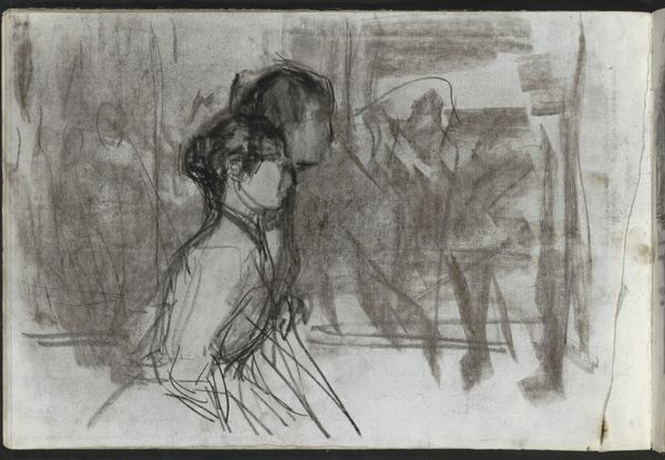Editor: So, here we have "Three Young Women, in Profile," a pencil drawing by Isaac Israels, dating from around 1886 to 1934. It has such a fleeting, ephemeral quality; I’m fascinated by the use of line to suggest form. How do you interpret this work through its formal elements? Curator: Indeed, the image's strength resides within its very construction. Consider the deliberate economy of line. Israels eschews precise contour, favouring instead a series of tentative, almost exploratory strokes. Note how these lines coalesce, suggesting the profiles, but never fully defining them. This creates a sense of movement, of the figures almost vibrating within the frame. Do you perceive how the negative space becomes as crucial as the drawn elements themselves? Editor: Yes, absolutely. The emptiness around the figures emphasizes their delicate presence. Also, I see the subtle variations in the pencil work, from lighter, feathery lines to darker, more emphatic marks. What does this variation suggest? Curator: Precisely. These tonal shifts contribute to the illusion of depth and volume. But more importantly, it highlights the artist's process, the act of seeing and recording. The drawing becomes a document of perception itself. This imbues the work with an authenticity and immediacy that transcends mere representation. Observe the composition and proportion also! Editor: That’s insightful! The sketch-like quality initially made me think of it as a study, but seeing it as a record of perception elevates it. I appreciate how focusing on these intrinsic formal aspects really opens up the reading of this seemingly simple sketch. Curator: Precisely. By attending to the work's inherent visual language, its line, tone, and composition, we gain a richer understanding. I’m delighted you appreciate that shift in perspective, and thank you.