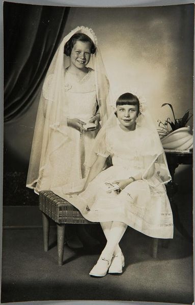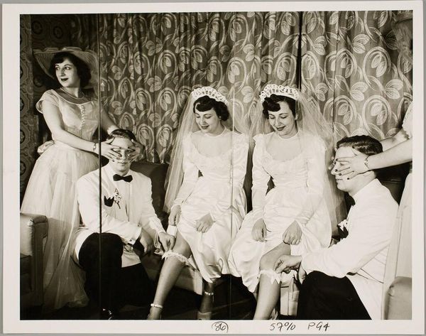 Curator: This photograph, simply titled "Untitled (woman with three children)," is attributed to Martin Schweig. It's currently part of the Harvard Art Museums' collection. Editor: The composition strikes me immediately. The woman, slightly off-center, creates a visual anchor, while the children radiate outwards like spokes from a wheel. Curator: The image resonates with a sense of idealized motherhood. Consider the mother's gaze, the children's postures—they evoke innocence and protection. Editor: Indeed, and the monochromatic palette enhances this sense. The soft gradations of tone lend the image a certain timelessness, almost a dreamlike quality. Curator: Black and white photography can strip away the superficial, allowing deeper archetypes to surface, a universal mother and her offspring. Editor: Perhaps, but I also find a certain coolness. The symmetrical backdrop and restrained poses give the scene a hint of formality, a constructed reality. Curator: That tension, between the posed and the genuine, is fascinating. It speaks to the complex role of the mother—both nurturer and guardian of social norms. Editor: I appreciate how we can both see different aspects of the composition and materiality in order to unravel the meaning.