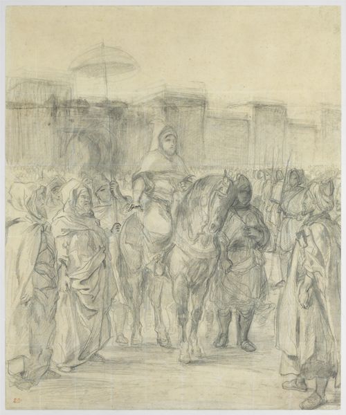 Eugène Delacroix made this graphite sketch as a study for his painting, "The Sultan of Morocco and His Entourage." Delacroix’s Orientalist paintings reflect France’s colonial ambitions in North Africa in the 19th century. France's conquest of Algeria in 1830 fueled European fascination with the "exotic" cultures of the region. Delacroix visited Morocco in 1832 as part of a diplomatic mission and was struck by what he perceived as the timelessness and authenticity of Moroccan life, in contrast to the perceived artificiality of modern European society. Consider how Delacroix’s image reinforces a colonial power dynamic, casting the Sultan as an object of European interest. Art historians look at travel journals, diplomatic records, and the writings of other artists and intellectuals from the time to better understand the context in which the art was produced. The meaning of this study, like any artwork, is contingent on the social and institutional forces that shaped both its creation and reception.