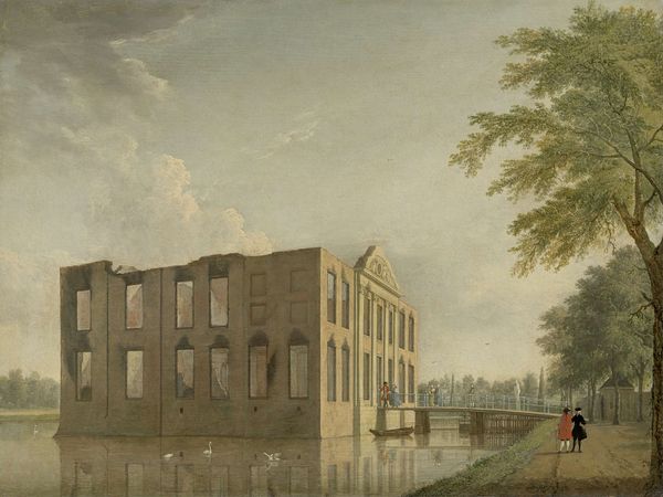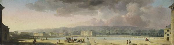 Editor: This is Hubert Robert’s *Recreation of Prisoners at Saint-Lazare; the Ball Game*, painted in 1794. The long shadows and pale sky give it a strangely peaceful feeling despite the context. I'm curious, what aspects stand out to you in this piece? Curator: What strikes me immediately is the institutional space, Saint-Lazare, transformed into a theater of social observation during the French Revolution. Robert, himself imprisoned there, cleverly documents the paradoxical freedom found even within confinement. Consider how the architecture dominates the composition; it’s not merely a backdrop but an active character shaping the prisoners' existence. Editor: It's like the building is both a cage and a stage, isn’t it? All those figures arranged so neatly in the courtyard make me wonder how Robert really viewed these individuals: a unified mass, or as isolated characters, unified by their incarceration? Curator: Exactly! It speaks to the social complexities of imprisonment during a period of revolutionary upheaval. Were these individuals perceived as a threat to the state, or simply victims of circumstance? Robert, by portraying them engaged in leisure, perhaps aimed to humanize the incarcerated in the face of growing political paranoia. How does that inform your view of the work? Editor: That perspective gives so much depth to a seemingly simple scene. I initially saw it as a picturesque genre painting. However, considering the revolutionary context and Robert's imprisonment, it shows that public spaces like Saint-Lazare could become stages of political and personal drama. I wonder if period gallery goers picked up on the subtleties. Curator: Indeed, this complicates our reading of the picturesque, as you suggested. This helps to see past just the beauty to the cultural forces behind it. Editor: This was definitely illuminating, moving past aesthetic to see artwork as an artifact.