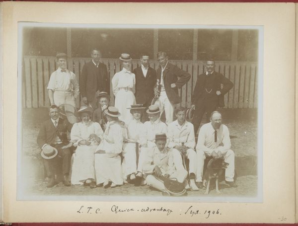Curator: This photograph, entitled "Leeraars- en onderwijzerspersoneel," translating to "Teachers and Educators Staff," was captured around 1902, and is presented to us as a gelatin-silver print. A perfect exemplar of early 20th-century photographic portraiture, don't you think? Editor: Absolutely. It feels like a scene from a novel, doesn't it? All those moustaches and the serious, almost melancholic atmosphere hanging in the air. What I find striking is the palpable sense of authority, yet somehow laced with a faint unease. Curator: Precisely. The composition lends itself to such readings. Notice the clear visual hierarchy; the figures in the front row are seated, claiming a sort of power dynamic that separates them visually from the ones standing at the back. It employs conventions that were emerging in Western institutional portraiture at the time. Editor: It’s staged, of course. You can feel that stillness; it's posed, with the central figures acting as anchoring focal points. The natural environment outside adds a unique visual flair to it all. Almost like theatre backdrop against which social identities are carefully staged. Curator: Indubitably. The landscape operates as a visual cue, embedding the subjects within a particular locale, presumably where they served as educators. This external setting influences the picture with layered connotations of exoticism tied closely to early 20th-century colonialism, while still fitting squarely within academic portraiture trends. Editor: What always gets me about photos from this era, the late colonial era as reflected in such settings and stiff postures, is the hidden narratives within those stiff smiles, don’t you think? Behind each rigid figure and those neatly combed moustaches, the quiet hum of untold narratives buzzes beneath. The contrast here feels key. This picture is far more nuanced and engaging on a deeper cultural level beyond what is presented superficially. Curator: I concur; and the tonal range in this gelatin-silver print really heightens this effect. The photograph oscillates tonally between crisp detail in the foreground figures to gentler fades at its environmental edge. It really captures the academic approach of its time—formally constructed, visually layered. Editor: And yet the photograph has this lasting resonance that draws me in! It really makes you consider all those unnamed subjects, their aspirations, as they existed inside the frame of a bygone era and fading memories. Curator: A fine perspective that mirrors exactly what such images hoped to achieve. A memento frozen by its materiality that is anything but simple and frozen, indeed. Editor: Precisely!