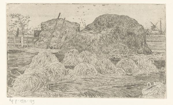 Pieter Dupont made this etching of haystacks in a field in 1895. In the late 19th century, rural scenes gained popularity, reflecting a nostalgia for a vanishing way of life amidst rapid industrialization. Dupont’s detailed rendering captures the texture and form of the haystacks, emphasizing the connection between the land and labor. Consider the role of agricultural workers, whose lives were deeply intertwined with these landscapes. The labor of these people, often marginalized, shaped the very fields depicted here. While seemingly pastoral, the scene hints at broader socio-economic structures influencing rural life. The presence of a distant windmill alludes to technological advancements gradually altering traditional farming practices. This image invites reflection on the complex relationship between progress, labor, and the land. It suggests a quiet, personal narrative amidst broader societal shifts.