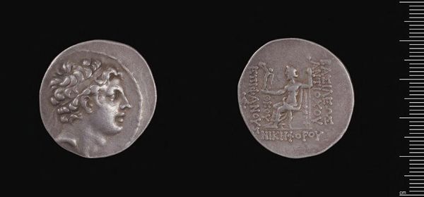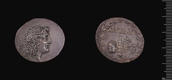 Curator: Here we have a silver tetradrachm, a coin, issued by Aesillas when he was quaestor in Macedonia. Editor: It's oddly compelling for a tiny thing. It feels heavy with history and kind of beat up, like it's seen a lot. Curator: Indeed. Coins like these offer insights into economic and political life in ancient Thessalonike. Aesillas held significant authority. Editor: I'm drawn to the portrait. There's something noble, but almost world-weary in those eyes. The roughness almost adds to the intensity. Curator: Coinage served as propaganda, meant to project power, but their circulation also integrated populations into new economic systems. Editor: It’s incredible to think about all the hands this passed through, all the stories it could tell. The legacy of that weight endures. Curator: Precisely. These small objects become invaluable cultural and historical artifacts.