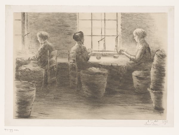 Herman Heijenbrock made this drawing of the Sphinx factory in Maastricht with chalk and watercolor, so it’s all about the surface and the light. I love how he uses a limited palette of grays and browns, punctuated by small details to create this scene. It’s like the whole drawing is exhaling, and then holding its breath again. Look at the way the figures are placed – each one seems caught in their own world, yet they're all part of this rhythmic, almost hypnotic process. There's one figure right up top, handing something down from the oven, and the others are carrying the pottery. You can almost feel the weight of those cylinders. It's heavy work and the artist really lets you feel the weight and labor of the people in the factory. It makes me think of other artists interested in labor, like Adolph Menzel, but where he focuses on machinery, Heijenbrock is highlighting the workers, which makes it interesting to look at and interpret!