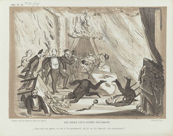 Curator: We’re looking at Honoré Daumier’s lithograph, "Les courses de chevaux", likely from the mid-19th century. What are your first thoughts? Editor: Utter chaos, but in an intentionally humorous way. Look at the tangle of limbs and exaggerated features. It feels like a frantic, slightly grotesque satire. Curator: Daumier was, after all, a master of caricature. This lithograph was mass-produced; many such images would have circulated widely in Parisian newspapers. His social critiques often focused on the bourgeoisie, their customs, and obsessions. We might think about this interest in the industrial process behind image production: printmaking made critique accessible to a much larger audience. Editor: The horses, or what we can see of them, appear almost monstrous, while the onlookers have these elongated faces and ridiculous hats, but their attire looks intricately patterned. There’s a distinct cultural insensitivity here. It also strikes me as deliberately absurd. Consider the incongruity of portraying a horse race involving, perhaps, a Chinese setting…The title translates to ‘horse races’. It plays on Western stereotypes of China. Curator: Exactly! And that speaks volumes about how Daumier uses visual shorthand to critique broader social phenomena. The material elements, lithographic stones and printing presses allowed his political ideas, wrapped up in humorous illustrations, to penetrate everyday Parisian life, offering critiques on labor conditions and class disparities, cleverly hidden inside of these depictions. It seems like something absurd can bypass censor and go straight into public’s consciousness. Editor: The pen strokes that define forms have this kind of dark quality to them as well as looseness; it almost feels gestural and frenetic. This creates an aura of disarray, or possibly futility. Everything becomes fleeting like the expression on those men faces or perhaps an expression on a race horse face. Ultimately, his composition underscores the pointlessness of the whole affair. Curator: Thinking about its availability to the public thanks to the industrial revolution that enabled the creation of a piece, it makes me think about the role of media production and how that changes art itself! Editor: Agreed, reflecting on the layered satire embedded in familiar symbolic references definitely gives new insight into both Western assumptions and Daumier’s intent.