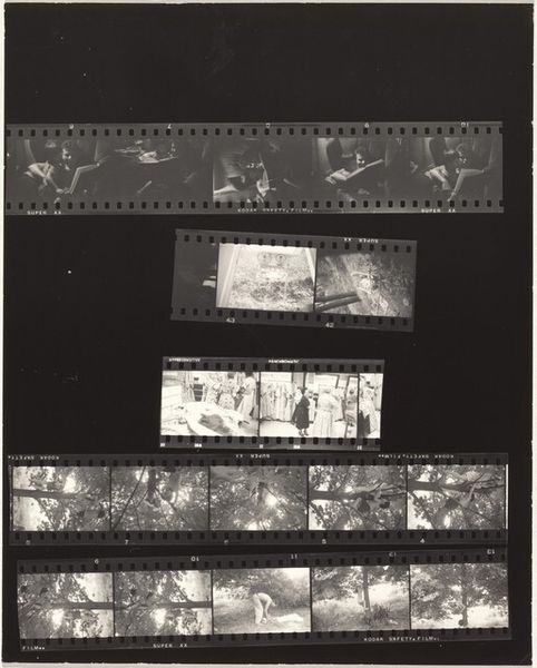 Editor: Here we have Robert Frank's "Paris 51A" from 1949-50, a gelatin-silver print, which I find very interesting in its layout resembling film roll with seemingly candid street scenes of post-war Paris. It's like we're looking at the raw material of photography, or maybe the artist's outtakes. What strikes you most about this compilation? Curator: What interests me here is Frank’s approach to documenting post-war Europe. The individual frames offer glimpses of daily life, but presented together like this, the entire contact sheet suggests a broader commentary. How does this method reflect Frank's position as an outsider looking in, recording rather than fully participating? Editor: That's insightful. I see the disjointed images hinting at fragmentation, a possible commentary on social unease post-war. Is it Frank perhaps showing a more fractured reality of Europe at that time? Curator: Precisely! Consider how institutions and galleries typically present singular, perfectly composed images. Frank disrupts that, showcasing the process itself and inviting viewers to question the "perfect" image. Does it challenge our assumptions of photojournalism? Is he more interested in the poetry of observation? Editor: Definitely makes me think about the selection process, and how much an artist's choices shape meaning. Presenting the frames together kind of democratizes photography, almost? Curator: I think that's a very interesting consideration! Seeing the individual frames like this forces us to actively engage in the narrative and consider photography not only as art, but also as document and social commentary. Editor: I never thought a sheet of photographs would provide so many cultural observations! Curator: It goes to show how a critical examination of an artist's intent can change your views on the artwork!